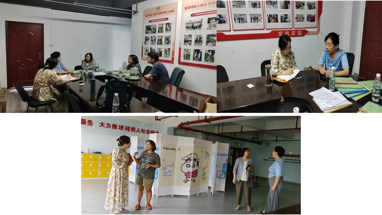 调研组参观了博爱阳光家园的服务场所,对机构文化建设、功能分区和设施设备进行观察了解,观摩了心智障碍学员的康复训练课堂。随后,调研组与博爱阳光家园服务团队进行座谈交流,了解博爱阳光家园在托养服务领域的经验和成就。博爱阳光家园主任刘晓老师介绍了机构的发展历程和托养工作开展情况。调研组对机构服务对象满意度情况进行调研。机构老师讲述了机构如何搭建与服务对象及其家庭的沟通渠道,深入了解服务对象的需求和意见,并根据这些反馈不断改进服务质量,获得了学员家长的一致好评。曾艳详细询问机构心智障碍学员的融合就业情况。当得知博爱阳光家园目前有3名心智障碍学员实现了长期稳定支持性就业、有10名心智障碍学员实现了辅助性就业时,曾艳对机构大力推进残疾人就业所取得的成绩给予肯定。