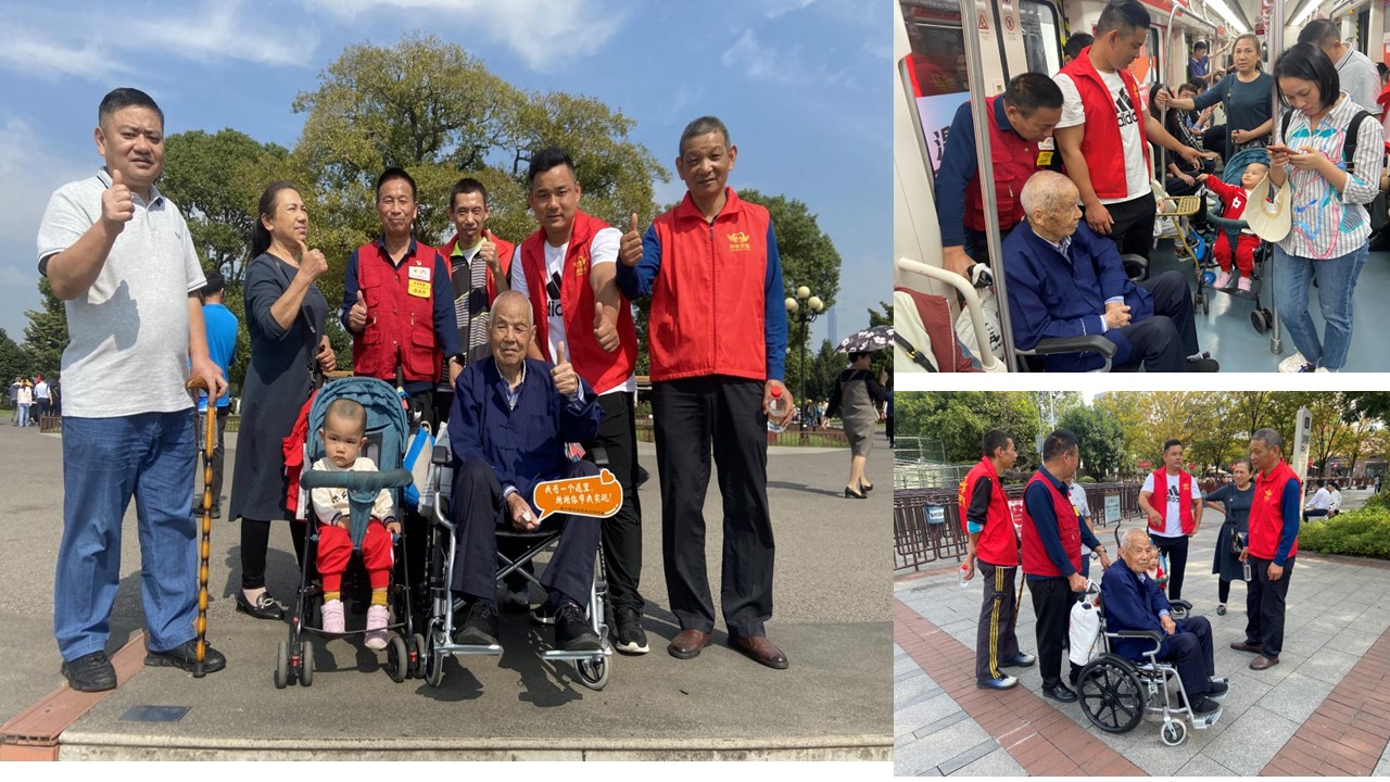 2023年11月3日,长沙市开福区博爱阳光家园残疾人托养机构社工龙瑞、周维,中国好人、党员志愿者袁亮坤一行带领机构心智障碍学员小鲸,陪伴滨江社区福嘉园小区96岁高龄周镜书老人乘坐地铁,秋游橘子洲。