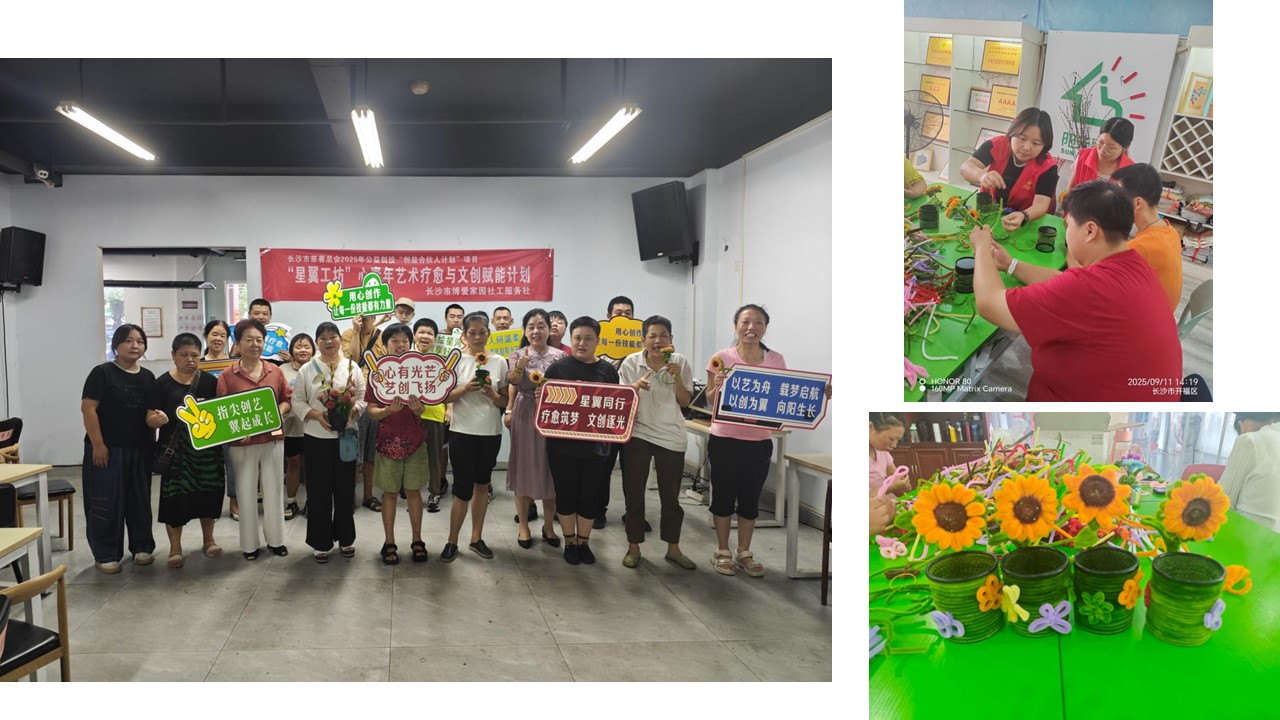 “我的笔筒上要贴红色的立体花,还要把串珠花粘在侧面!”日前,在长沙市博爱家园社工服务社组织开展的“星翼创艺启航”文创技能培训课堂上,来自长沙市开福区博爱阳光家园的心智障碍学员小鲸拿着自己前期制作的扭扭棒花饰,认真地和志愿者讨论笔筒装饰方案。这次的培训主题是“空白笔筒改造与花饰组装”,该活动是长沙市慈善总会2025年公益创投“创益合伙人计划”——“星翼工坊”心青年艺术疗愈与文创赋能项目的内容之一,旨在通过艺术疗愈和文创技能提升,帮助心智障碍者增强自信、提升就业能力并融入社会。