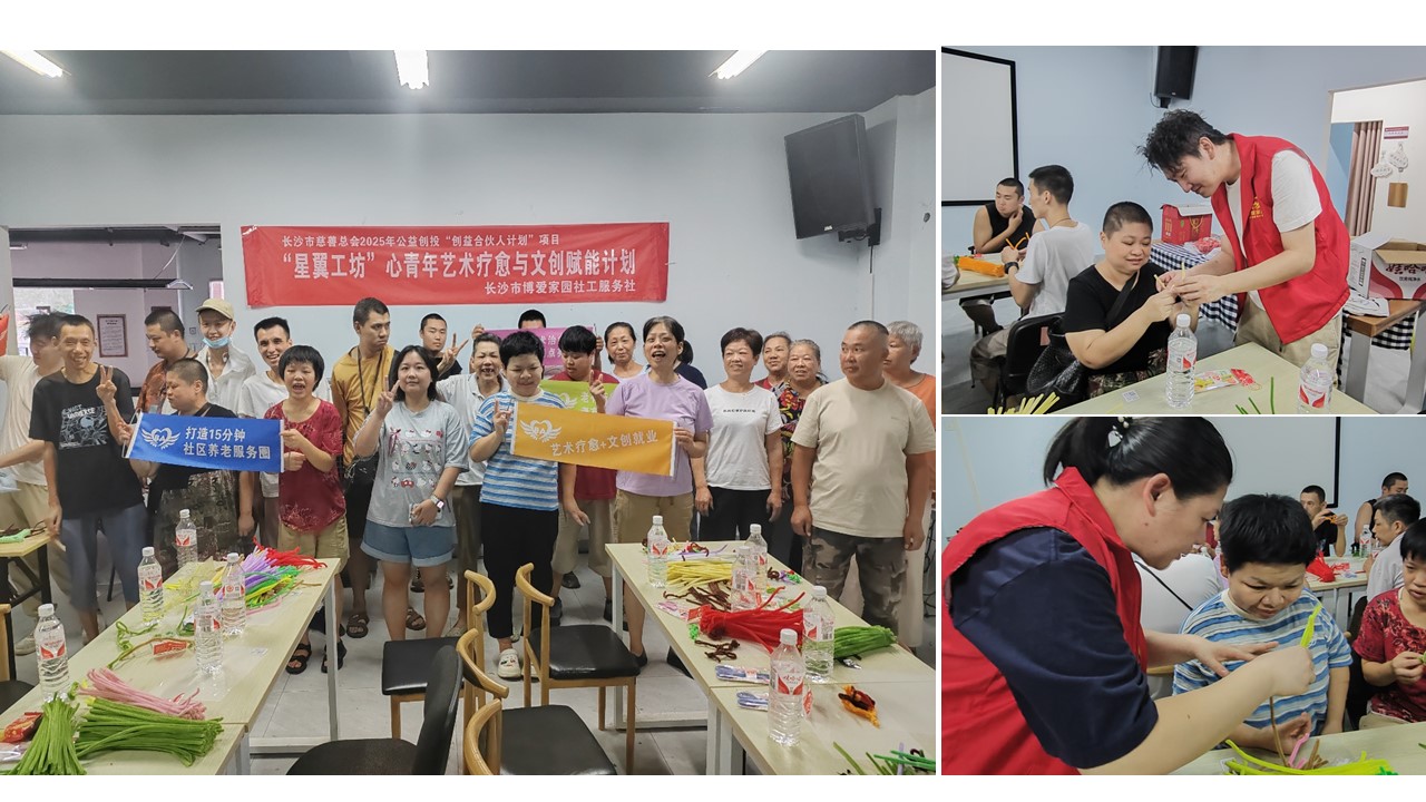8月26日,长沙市博爱家园社工服务社联合长沙市开福区博爱阳光家园残疾人托养机构组织15名心智障碍者开展“星翼创艺启航”文创技能培训第一课——学习制作扭扭棒花朵。该活动是长沙市慈善总会2025年公益创投“创益合伙人计划”——“星翼工坊”心青年艺术疗愈与文创赋能项目的内容之一,旨在通过艺术疗愈和文创技能提升,帮助心智障碍者增强自信、提升就业能力并融入社会。
