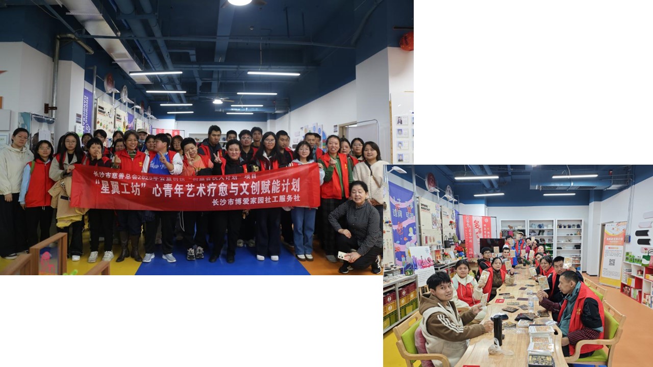 11月10日上午,长沙市博爱家园社工服务社组织长沙市开福区博爱阳光家园残疾人托养机构的心智障碍者学员(心青年)前往长沙市芙蓉区蒲公英社会工作服务中心开展文创交流活动,开启了一场收获满满的星翼灵感之旅。本活动是长沙市慈善总会2025年公益创投“创益合伙人计划”——“星翼工坊”心青年艺术疗愈与文创赋能项目的内容之一,旨在通过艺术疗愈和文创技能提升,帮助心智障碍者增强自信、提升就业能力并融入社会。