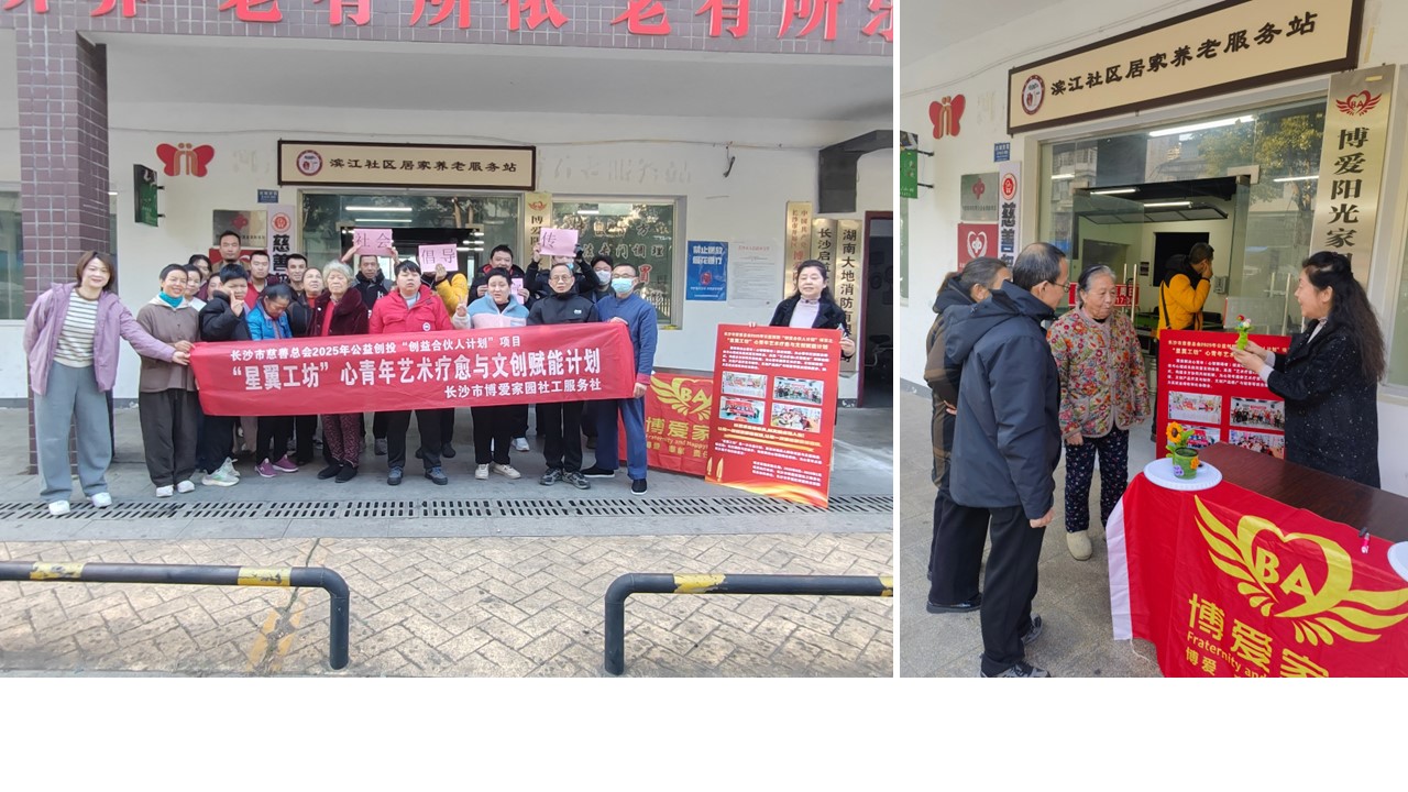 老残融合,真情暖心。2026年1月14日上午,长沙市博爱家园社工服务社携手长沙市开福区博爱阳光家园残疾人托养机构心智障碍者学员、滨江社区居家养老服务站老年人志愿者,在四方坪街道滨江社区成功举办了主题为“‘心’光闪耀·文创筑梦”的心青年文创社区公益宣传推广活动。本次活动是长沙市慈善总工会2025年公益创投“创益合伙人计划”——“星翼工坊”心青年艺术疗愈与文创赋能项目的内容之一,旨在向社会公众推介心智障碍者群体,展现其积极向上的精神风貌与文创才华,传递支持心青年增强自信、提升就业能力、融入社会的公益理念。