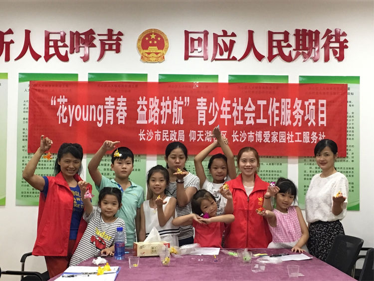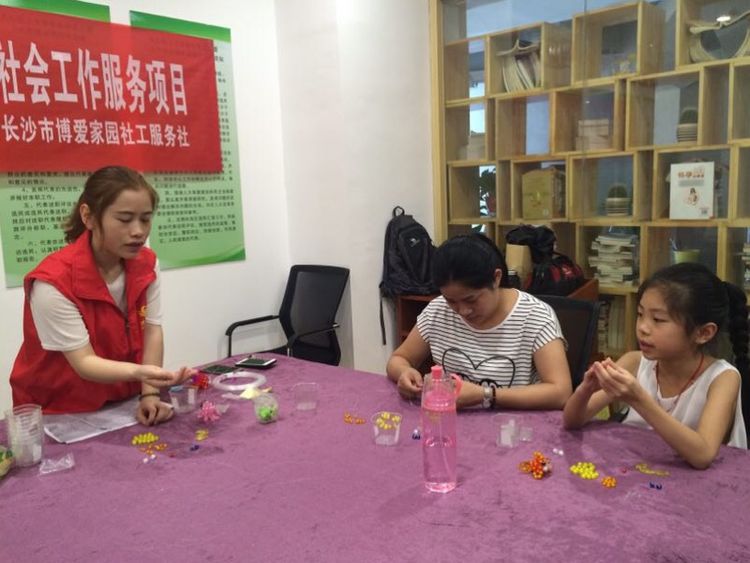 本网讯:2017年7月27日上午9:30-11:30,亲子兴趣课堂的第三场在仰天湖社区活动中心顺利开展。此次课堂由长沙市民政局、仰天湖社区、博爱家园社工服务社一同开展,是2017年度社会工作发展示范创建项目——"花young青春·益路护航"青少年社会工作服务项目的内容之一。亲子兴趣手工课堂一共在暑期开展12场,第三场是制作手工串珠金鱼。