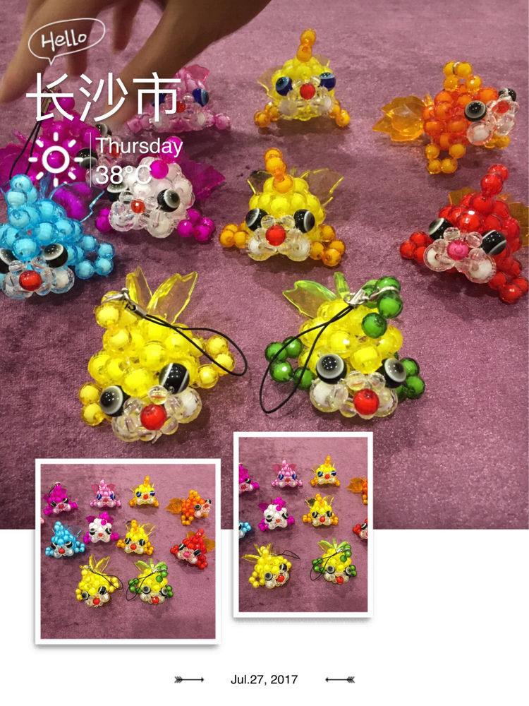 串珠金鱼的制作过程比起前两节串珠蜻蜓的制作过程来说可是难了许多,所以在中后期的金鱼制作过程中,不停的有家长和孩子反应"我又不会做了"、"好难啊"、"下一步该做什么啊",社工一边教学一边鼓励参与的家长和孩子。"金鱼的制作有难度,大家学的很快,动手能力也很强,已经做的很好了,大家不要着急,静下心有耐心一点慢慢制作,大家可以一起感受串珠的美好!"在社工的鼓励和引导下,一颗颗五颜六色的串珠在小朋友和家长手中转动着,金鱼的尾巴和肚子开始渐露雏形,金鱼的鱼鳍和头部也渐渐成型。在大家的共同努力下,一只只可爱漂亮,栩栩如生的金鱼呈现在大家眼前。看着一只只色彩缤纷的金鱼,大家都感觉之前的努力是值得的。