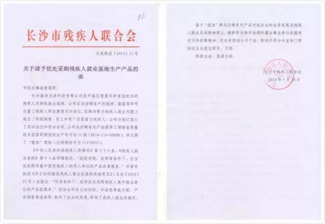 长沙市残联发出优先采购澈洁公司残疾人产品的函