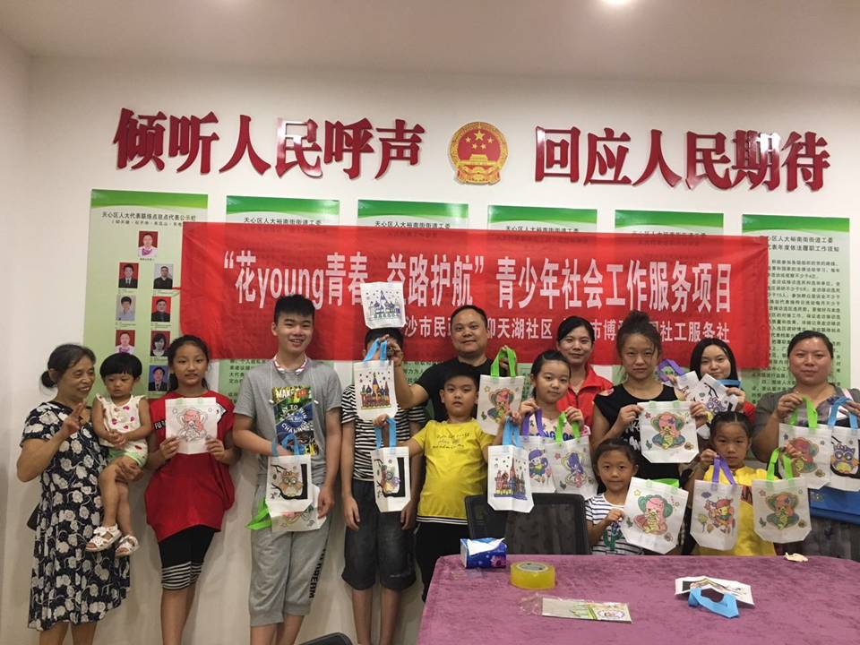 本网讯:2017年8月22日上午9:30-11:30,仰天湖社区亲子兴趣课堂第五场在仰天湖社区活动中心顺利开展。此次活动由长沙市民政局、仰天湖社区、博爱家园社区服务社一同开展,是2017年度社会工作发展示范创建项目——“花young青春·益路护航”青少年社会工作服务项目的内容之一。亲子兴趣手工课堂一共在暑期开展12场,第5场是手工DIY环保袋。