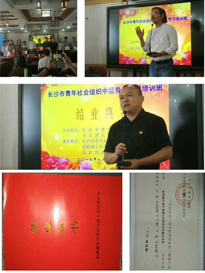本网讯:2017年9月1日在长沙民政学院举办的为期5天的长沙市青年社会组织中层骨干学习培训班圆满落幕。此次活动由长沙市市委组织部和共青团长沙市委共同主办,由长沙市青年社会组织孵化中心、民政部长沙市基层民政干部培训中心、长沙市民政职业技术学院承办。全市青年社会组织中层骨干代表共70人参加本次培训。共青团长沙市委副书记赵雪峰、长沙民政职业技术学院培训部主任徐怀、长沙民政职业技术学院社会工作学院副教授刘战旗参加本次开班仪式。长沙市博爱凤亭家园社工谢丽红参加此次培训。 培训结束后,民政部长沙市基层民政干部培训中心为学员发放了结业证书。