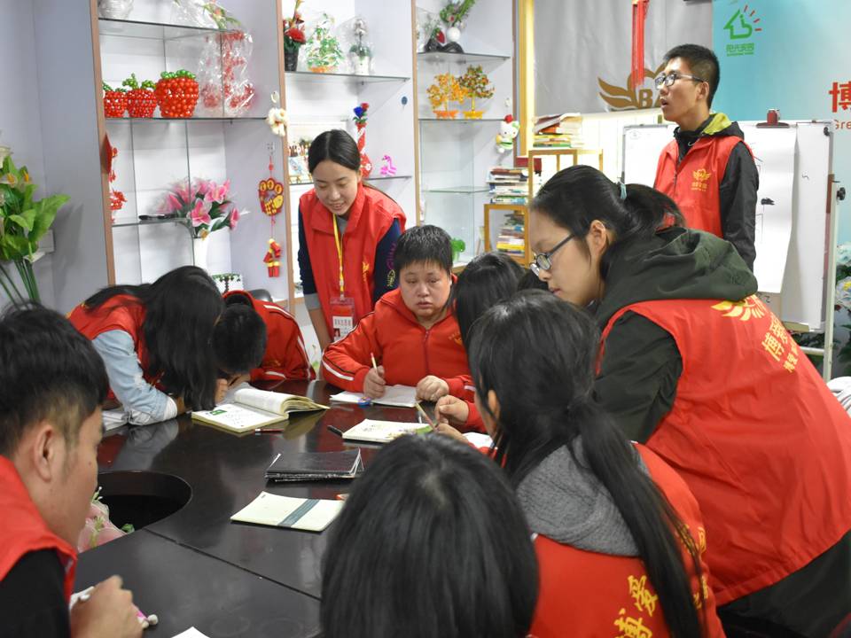 本网讯:2017年11月9日下午, 湖南师范大学的大学生志愿者来到了博爱凤亭家园为心智障碍学员开展志愿教学服务,奉献爱心。博爱家园社工、心智障碍学员、志愿者共26人参加了此次活动。