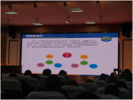 此次培训的讲师为深圳市东西方社工服务社总干事于文涛老师。于老师围绕本次培训主题,从“公益项目特征”、“公益项目的设计、执行与监测”、“项目的计划逻辑框架”、“项目的预算和评估”等多个方面展开论述,内容丰富,讲解生动。培训现场,于老师就具体案例让社工们进行现场分组练习,对问题进行识别和成因分析,明确问题的目标和后果,让大家在以后的实际工作中能够举一反三,具体问题具体分析。