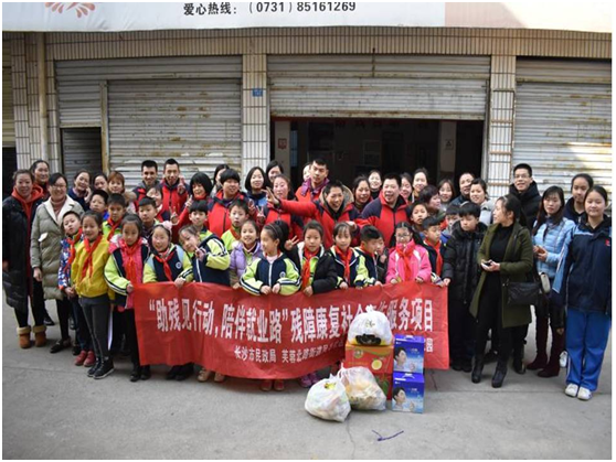 本网讯:2018年2月3日下午,桔园小学三(2)班小学生及家长共35人携爱心物资,来到博爱凤亭家园和心智障碍学员一起开展了志愿服务联谊活动。此次活动是长沙市民政局2017年度社会工作发展示范创建项目“助残见行动,陪伴就业路”残障康复社会工作服务项目的内容之一,由长沙市民政局、芙蓉北路街道凤亭社区、长沙市开福区博爱凤亭家园共同开展,旨在提升心智障碍者自我价值感,丰富其精神文化生活,让社会大众了解心智障碍群体,倡导残障平等。